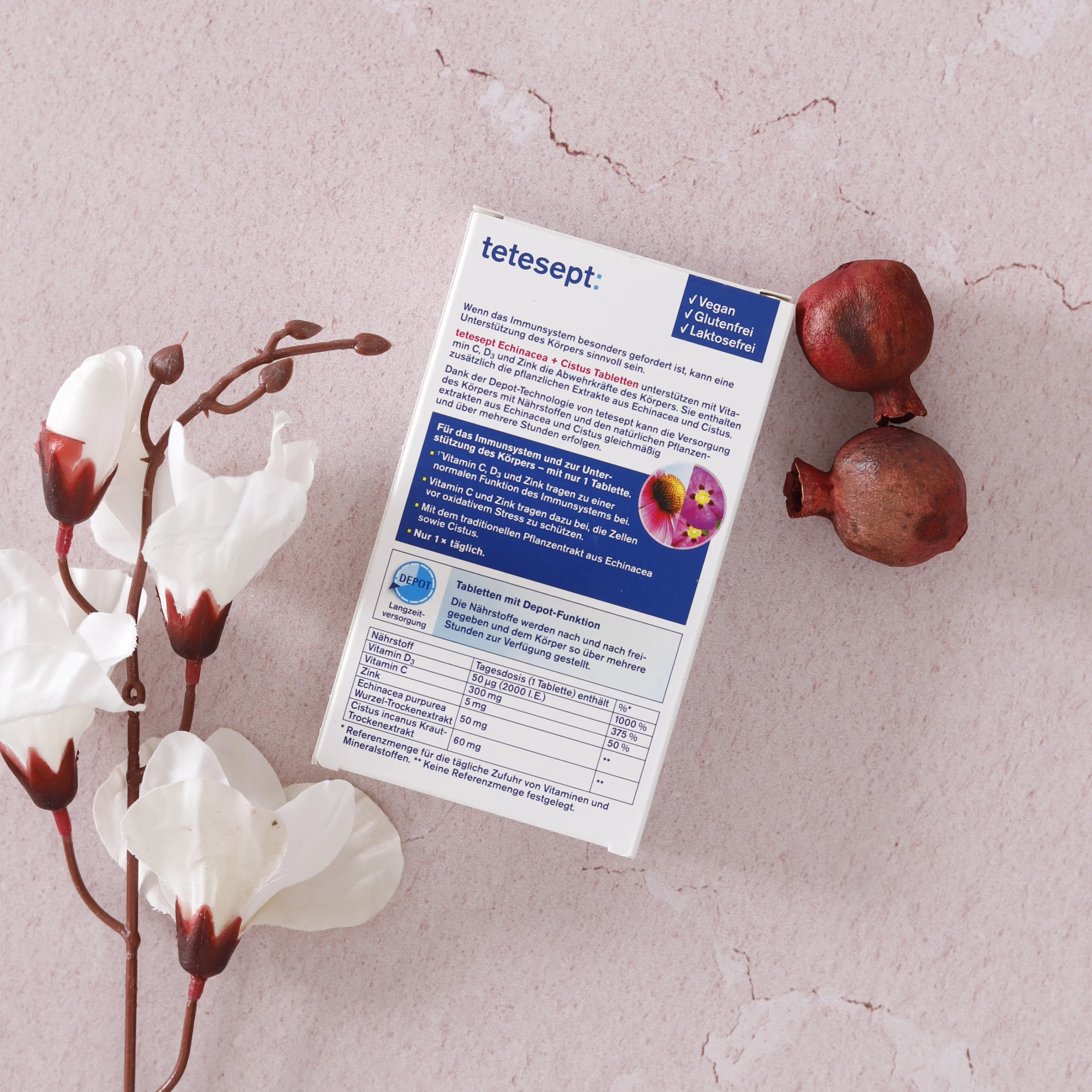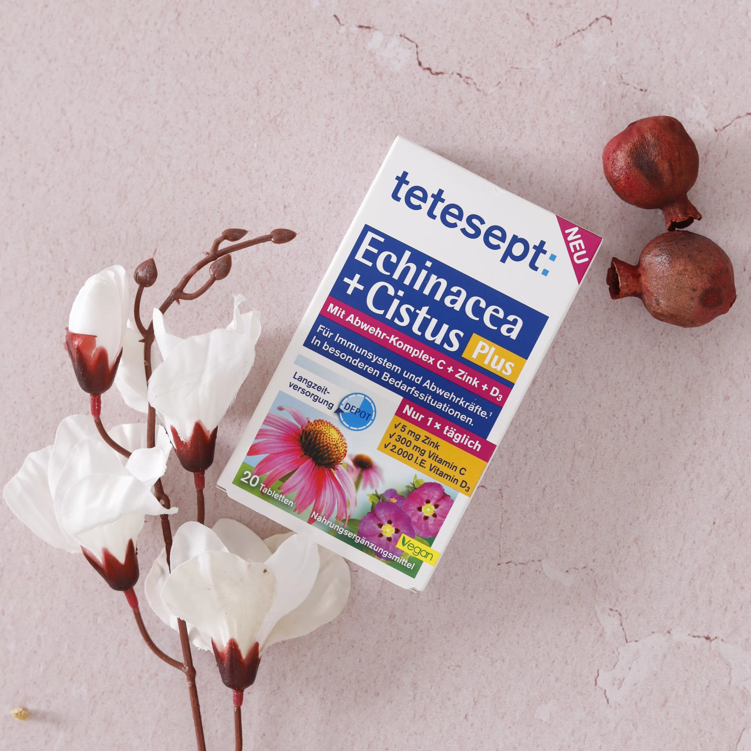 • در شرایطی که سیستم ایمنی بدن تحت فشار خاصی قرار دارد، حمایت از بدن می‌تواند مفید باشد.قرص‌های اکیناسه + سیستوس تتسپت، به واسطه ویتامین‌های C و D3 و همچنین روی، از دفاع بدن پشتیبانی می‌کنند. آن‌ها همچنین حاوی عصاره‌های گیاهی اکیناسه و سیستوس هستند. به لطف فناوری رهش پایدار تتسپت، بدن به طور پیوسته مواد مغذی و عصاره‌های گیاهی طبیعی اکیناسه و سیستوس را در طی چند ساعت دریافت می‌کند. برای حمایت از سیستم ایمنی و سلامت کلی بدن – فقط با یک قرص.